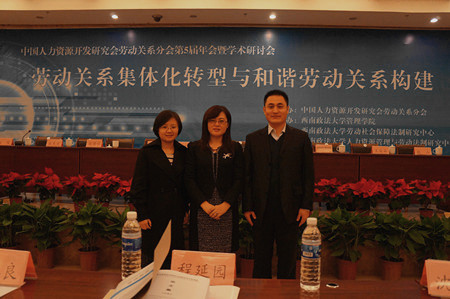 张红凤院长、路军副教授、贾海彦副教授和焦霄黎博士分别作了题为“我国职业安全规制困境与多中心治理框架下的解决路径”、“罢工潮传导机制研究——以2010年中国罢工潮为例”、“劳动关系方向在劳动与社会保障专业中的定位与发展——基于公共管理类人才培养模式视角”和“企业劳动关系和谐度评价指标体系研究”的报告。路军副教授(合作)提交的“劳工三权实现的政治空间——地方政府与工人抗争的互动”论文荣获年会优秀论文三等奖。