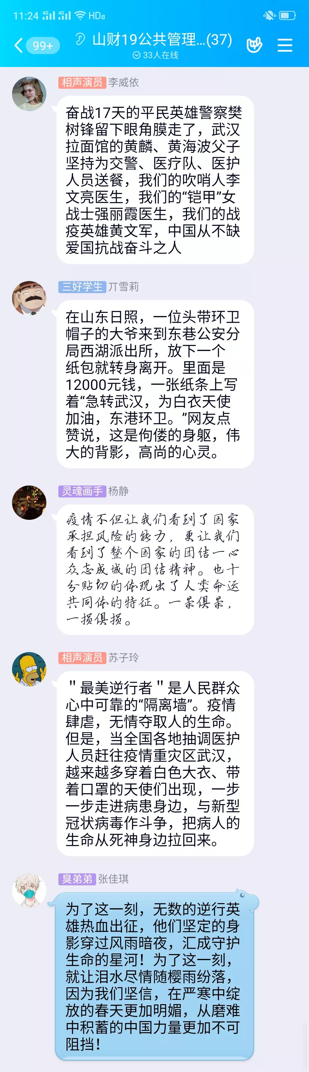 举办了“青年大学习”线上主题团课大讨论活动,各团支部以“不惧风雨、勇挑重担”、“当代青年要勠力同心,同心抗疫”、“防控战疫阻击战最美逆行者”、“青年有理想、有担当,民族就有希望”等为主题,展开精彩纷呈的线上讨论,通过网络平台交流体会,传递感悟。