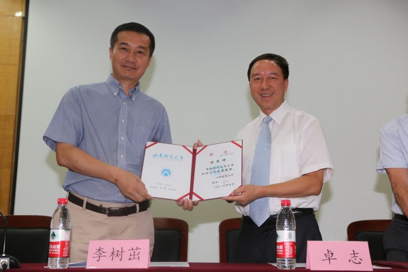 以及公共管理学科的发展历程和建设成绩。随后,卓志校长向两位客座教授的到来表示欢迎,并向两位教授颁发了“公共管理学科客座教授”的聘任证书。李树茁教授做了受聘感言。