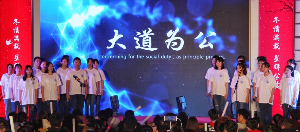 晚会的第三篇章,希冀公管·腾飞。朗诵《盛世华章 不负芳华》回顾改革开放40周年中国的腾飞历程,体现公管不辱时代的崭新使命,我们踏着激情的步伐来到公管,在公管抒发最美情怀。如果说,独唱《一个人的北京》给人以宁静舒缓的听觉感受;那么,融汇了藏族舞、维吾尔族、傣族舞和汉族舞的《民族大联欢》则带给观众繁富华丽的视觉享受。最终,晚会在大合唱《明天你好》和《公管之歌》中缓缓落下帷幕。