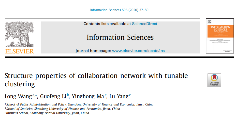 青年教师王龙博士与统计学院李国锋教授等合作撰写的学术论文《Structure properties of collaboration network with tunable clustering》于2020年1月在《Information sciences》期刊506卷上发表。该期刊为我校特类期刊(SCI,IF:5.524)。