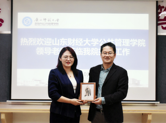 肖富群院长欢迎张院长一行到访,介绍了广西师大政管学院的基本情况,近年来在教学、科研等方面的主要成绩以及在教师绩效考核、MPA招生与教学等方面的相关经验。