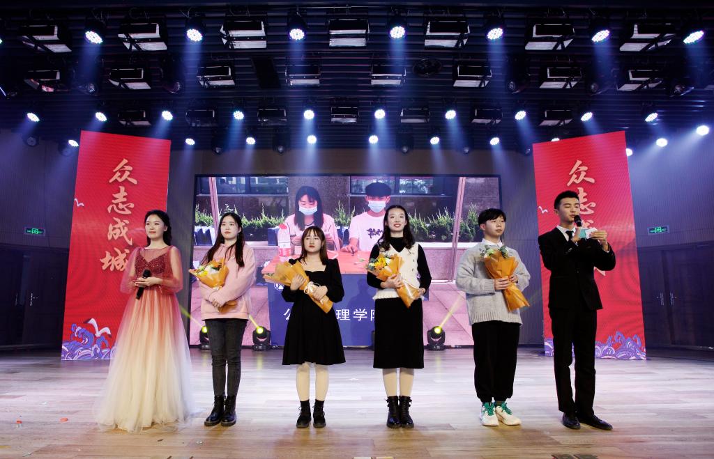 晚会进入第二篇章:同心·共克时艰。屏幕上闪现出中国抗击疫情时的种种场景,抗击疫情时中华儿女的凝心聚力,一往无前再度展现在眼前,让同学们再次感受到了中国英雄之气魄,更加明确了中国青年肩上所负之重任。朗诵节目《中国精神》将中国精神讲得淋漓尽致,朗诵者沉静稳重与热情澎湃并济,真情流露。接着进入优秀志愿者采访环节,志愿者的倾情分享体现了公管学子有担当,有作为的精神风貌。小合唱《听我说,谢谢你》表达了同学们对抗疫英雄的真诚感恩与崇高敬意。古典舞《雪意冬情》,衣袂翩翩,琴瑟相鸣,给观众展现了一个诗情画意的世界,体现了中华古典舞的气韵之美,同时也让大家在这个寒冷的冬天感受到脉脉温情。歌曲《沧海一声笑》,挥洒出万丈豪情,展现青年气概,加上校武术协会带来的精彩武术表演,更显中华儿女的蓬勃朝气。