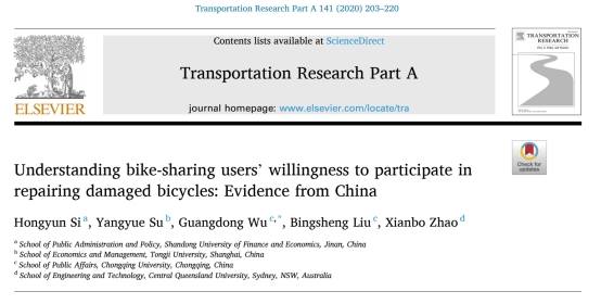 青年教师司红运作为第一作者撰写的论文《Understanding bike-sharing users’willingness to participate in repairing damaged bicycles: Evidence from China》于2020年11月在期刊《Transportation Research Part A: Policy and Practice》第141卷发表。该期刊(简称TRA)为ABS三星,FMS A级,SSCI 1区,系我校特类期刊。