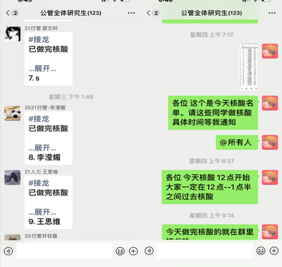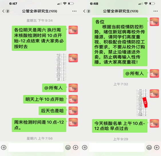 党委高度重视对研究生疫情防控的宣传工作,建立学院全体研究生疫情防控微信群,第一时间发布疫情防控工作通知、预防知识、学校党委的最新部署等内容,把疫情防控相关信息传达到每一个研究生。让研究生充分认识到当前疫情防控形势的严峻性,准确把握各级防控工作要求,筑牢抗击疫情的思想防线。研究生辅导员每天在群里提醒同学们按时去做核酸抽检,并在核酸抽检完毕后组织学生接龙。全面摸清、精准把控在校103位研究生的健康状况、思想状态、心理状态和行动轨迹。