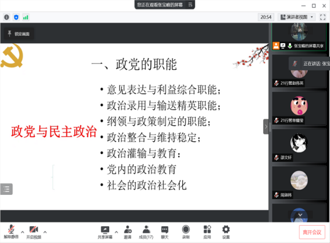 在《中国政府与政治专题》课上,张宝峰老师每堂课按时进入线上教学平台,利用连麦与评论区的互动功能,与同学们就古代与现代“中国政治体系”、国内与国外制度安排以及“制度与制度变迁”等内容进行了热烈的讨论,师生配合,积极完成线上教学与学习任务,合理高效的进行着“云端课堂”教学模式。