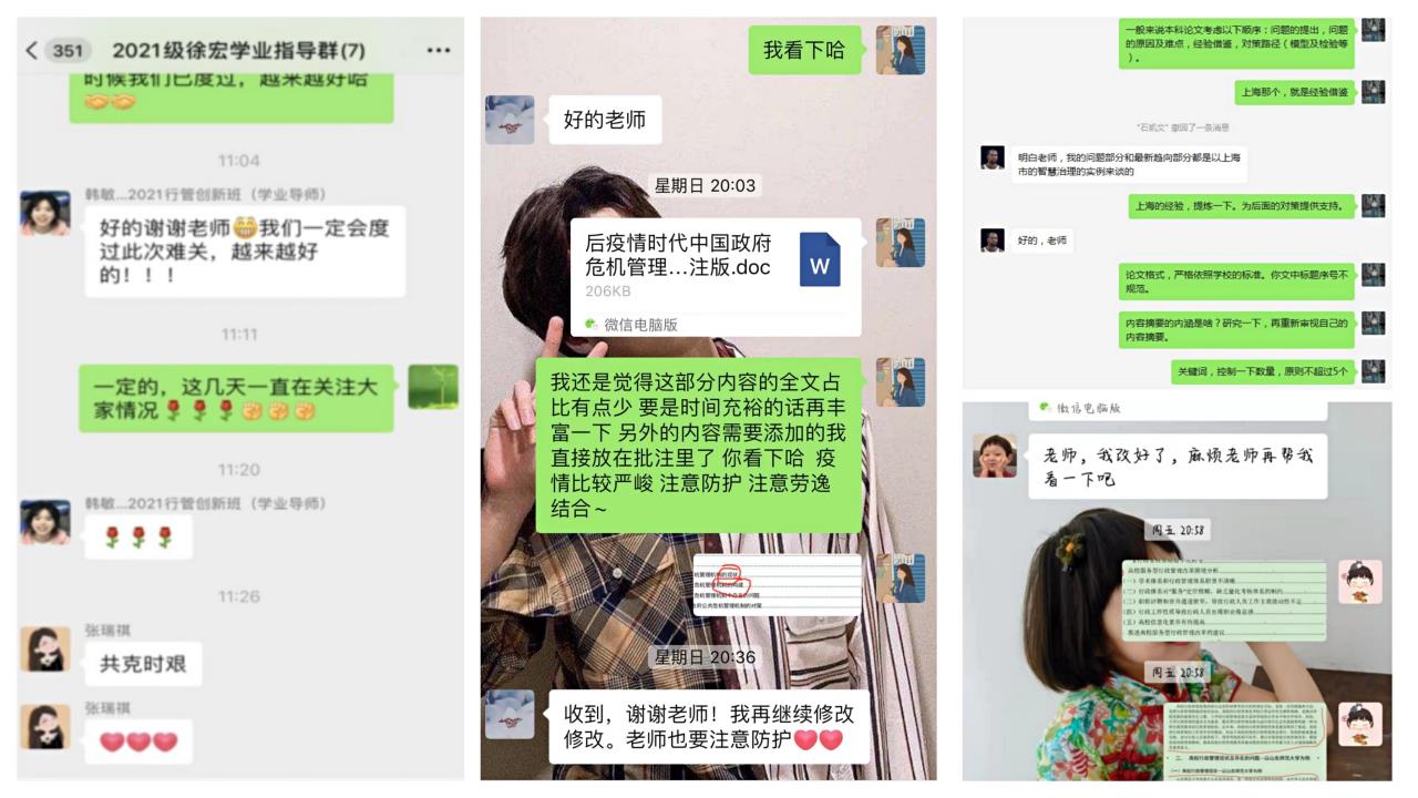 学院各位本科生学业导师根据网络教学特点和学生实际需要,积极开展“线上学业指导”。老师们一方面叮嘱同学们疫情期间要认真做好防护工作,保持积极乐观的良好心态,合理安排学习、生活、娱乐和睡眠时间,做好自我学习管理、生活管理和健康管理;另一方面,对同学们在个人学业规划、专业课程学习、社会实践与学科竞赛、研究生考试、公务员考试、毕业论文以及就业等方面进行遇到的问题分别进行针对性地指导。