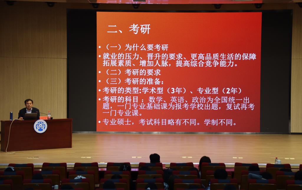 在“如何过好大学生活”这一专题中,张红旗提出要提前了解好想从事的岗位、向往的生活状态与现在所学专业的关系,提早谋划,未雨绸缪。他围绕“转变学习方式、确立奋斗目标、考研与推免、出国留学、政策性岗位就业、企业单位就业、创业”七个方面,针对不同的就业方向,认真细致地介绍了每一方向的基本要求及对应的准备方案,还整理出了常用的资源渠道以帮助同学们及时了解最新的就业信息与最新就业动态。