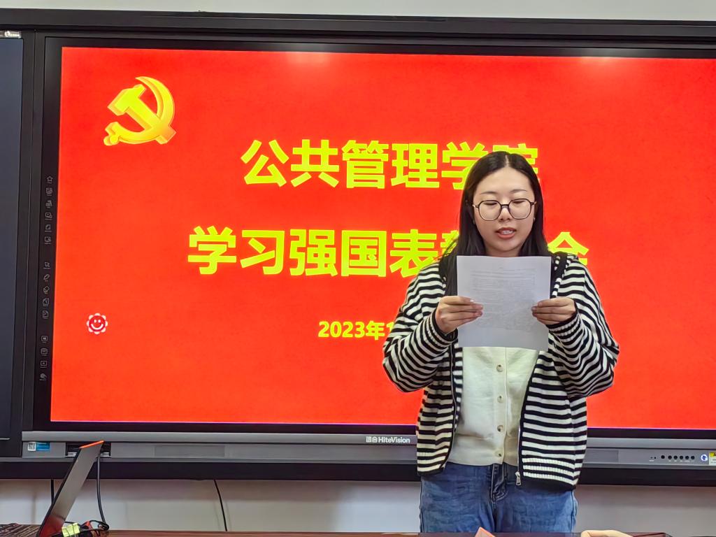 会上,罗微宣读了《关于对“学习强国”优秀支部和学习标兵进行表彰的决定》。《决定》指出:自“学习强国”学习平台推广使用以来,学院党委把用好“学习强国”平台作为学习贯彻习近平新时代中国特色社会主义思想的重要举措,迅速行动,积极部署,各支部书记积极响应,认真组织。通过读文章,看视频,比成绩,“晒”积分,涌现出了一大批勤学习、爱学习、乐学习的先进典型。为推进“学习强国”学习活动深入开展,截至2023年11月30日,根据积分排序,决定授予办公室党支部优秀支部荣誉称号,授予李昭娜、朱艳、张红凤、刘玉安、孙敬华、张宝峰、张溪等17名同志“学习强国”学习标兵荣誉称号。