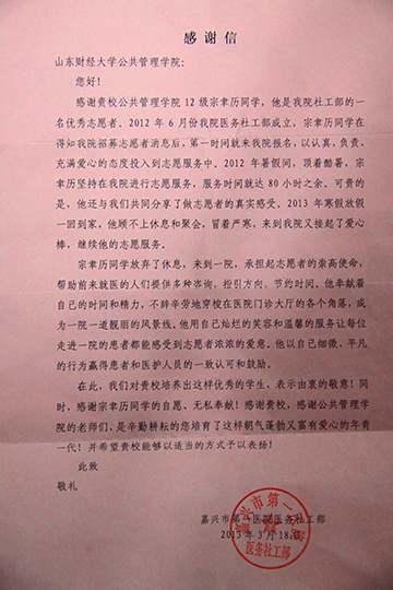 MX动漫 2012级学生宗聿历,是嘉兴市第一医院医务社工部的一名优秀志愿者。自2012年6月嘉兴市第一医院社工部成立以来,宗聿历同学一直以认真、负责、充满爱心的态度进行志愿者服务。无论是炎热的暑假,还是寒冷的寒假,宗聿历同学只要一回到家,就会继续他的志愿服务。他用放假休息的时间来到医院,不辞辛劳的服务在医院的每一个角落,感动着每一位患者和医护人员。为此,嘉兴市第一医院医务社工部特别向MX动漫 发来感谢信,感谢宗聿历同学的无私奉献,感谢MX动漫 培养出如此优秀的学生。