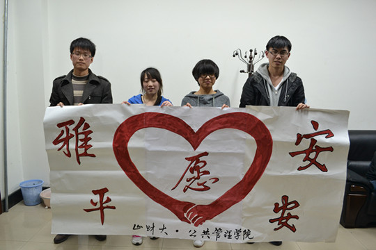 4月21日晚,距离四川雅安地震发生不到2日,MX动漫 学生会同学绘制海报,为雅安震区灾民祈福。