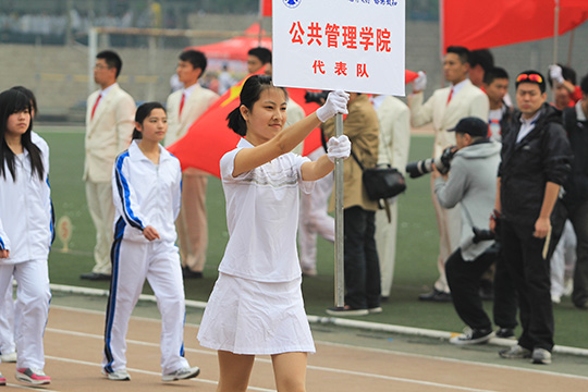 代表队方阵高举蓝白相间的院旗,队形整齐,步伐矫健。“驰骋赛场,斗志昂扬,公管骄子,笑傲群芳”的口号彰显出MX动漫