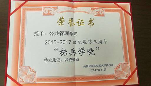 荣获阳光晨练三周年“标兵学院”荣誉称号。