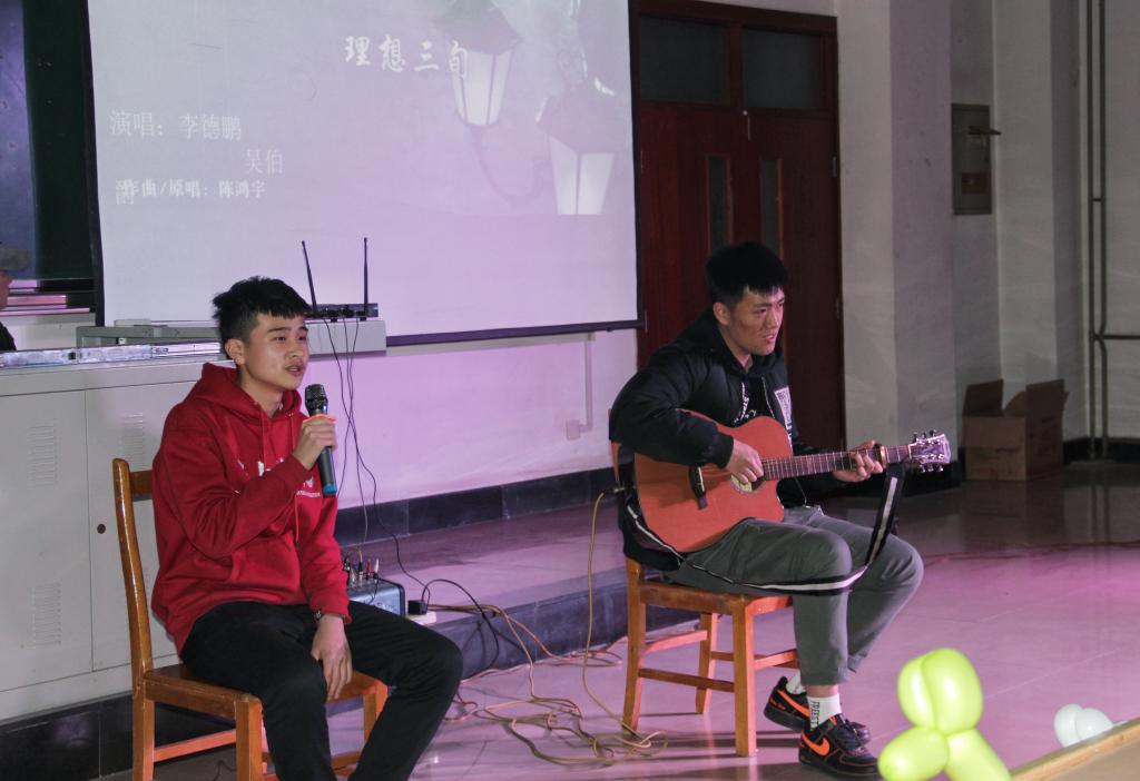 晚会共分为两个个部分。第一个节目由李德鹏、吴伯爵同学带来吉他弹唱《理想三旬》,在梦幻的灯光与荧光棒的交替挥舞中,通过歌声讲述在山财追求理想的日夜。随后,清平乐坊为大家带来《千本樱时,权御天下》民族乐器合奏,琵琶古筝、二胡横笛,再配以小提琴穿插其中,乐曲曲风古典而节奏动感,古风与现代感交汇相融,带给现场一场听觉盛宴。传统文艺继续进行,陈广昊、周皞阳与宋婉宁同学为大家带来相声表演《双字意带报菜名》,展现了经典相声艺术与精湛技巧,并且极为风趣幽默,逗得现场观众捧腹大笑。第一环节结束,穿插了暖场游戏猜歌名,现场气氛热烈。