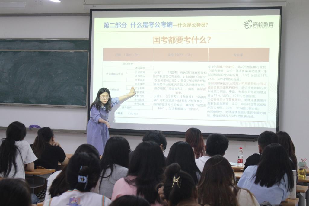 本次讲座主要从职业规划、了解考公考编、备考规划三个方面展开讲述。张晶运用详实的统计数据介绍了公职考试概况,对公考考试进行了详细说明,包括国考、省考及其他政策性岗位的报考条件、考试时间安排、岗位设置、考试内容、竞争压力、优劣势比较等,对同学们进行了具体的讲解和细致的答疑。同时,张晶罗列出部分近年考试真题让同学们进行实战演练,引导大家了解考试的相关技巧与方法,她指出,考公不仅要有充分的知识储备,更要有科学的备考规划,要自主规划好时间,保持足够的耐心和信心去应对挑战。