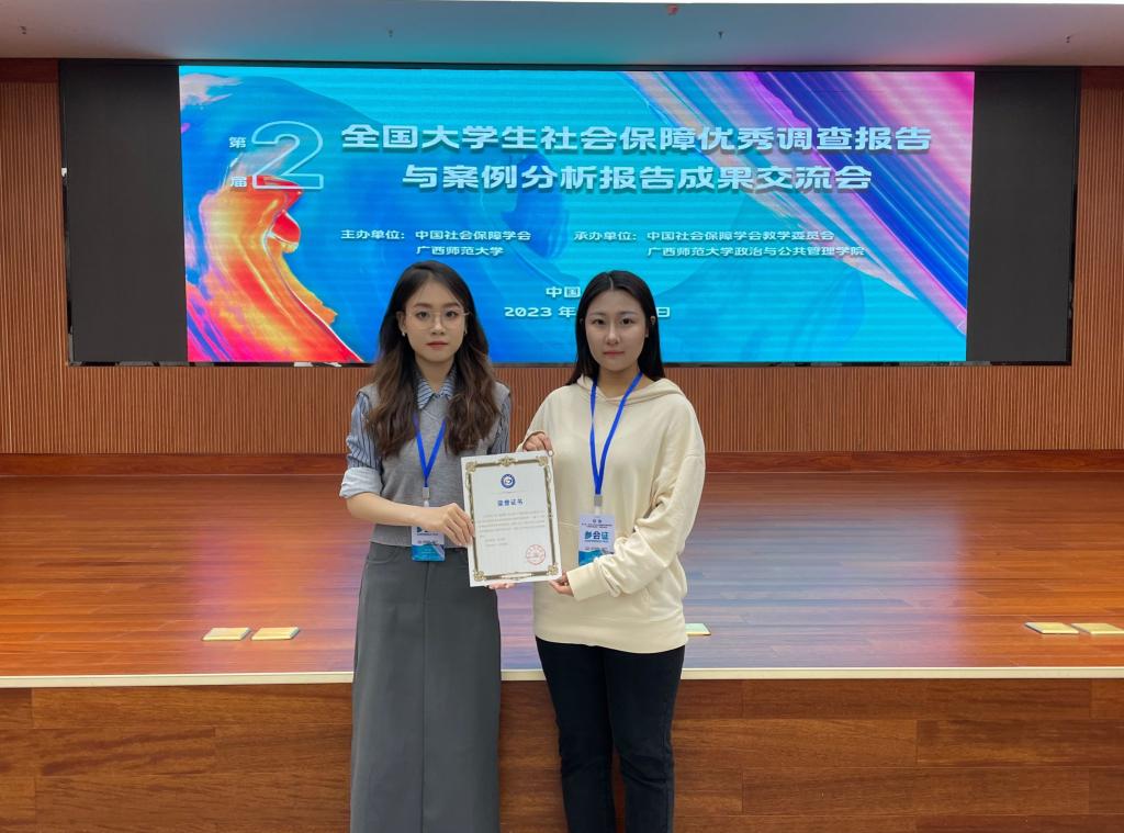 2021级行政管理专业本科生焦凤博作为负责人完成的《打通医养结合的“最后一公里”:养老机构医养结合实施现状及模式创新研究——基于17家医养结合型养老机构的调研》,被评选为社会保障优秀调查报告。指导老师贾海彦、许薇携2021级本科生焦凤博与2022级研究生郭紫曦赴桂林参加成果交流会。
