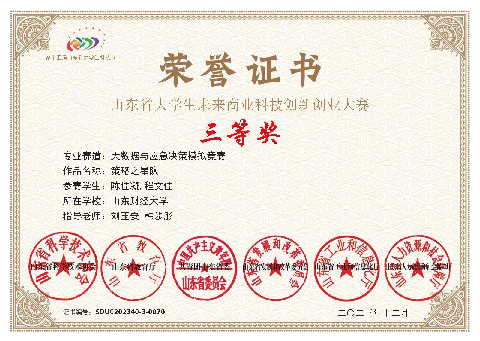 刘玉安老师和韩步彤老师共同指导的两支学生团队代表我校在第十五届山东省大学生未来商业科技创新创业大赛中分获一等奖和三等奖,刘玉安和韩步彤被评为优秀指导教师。