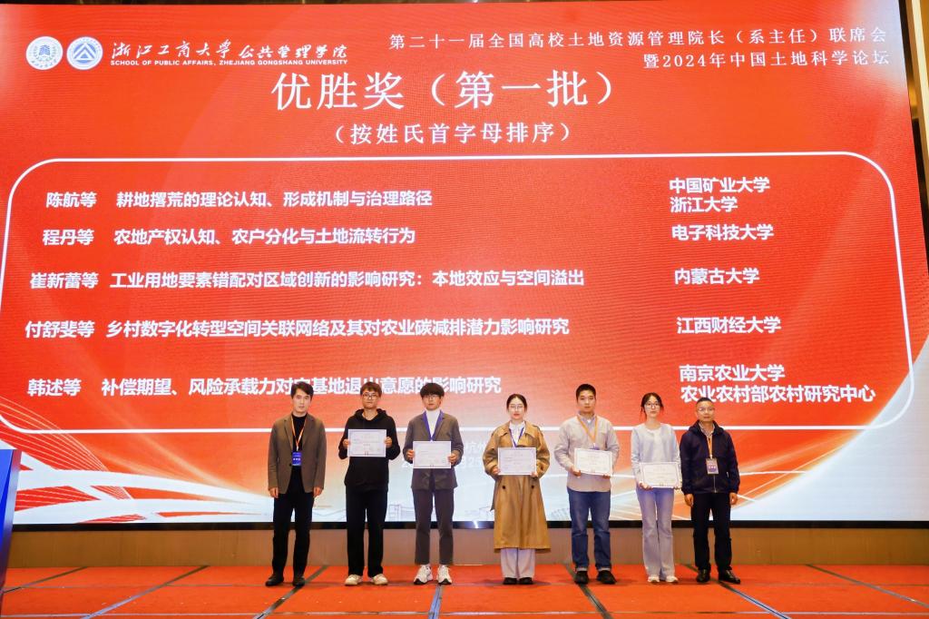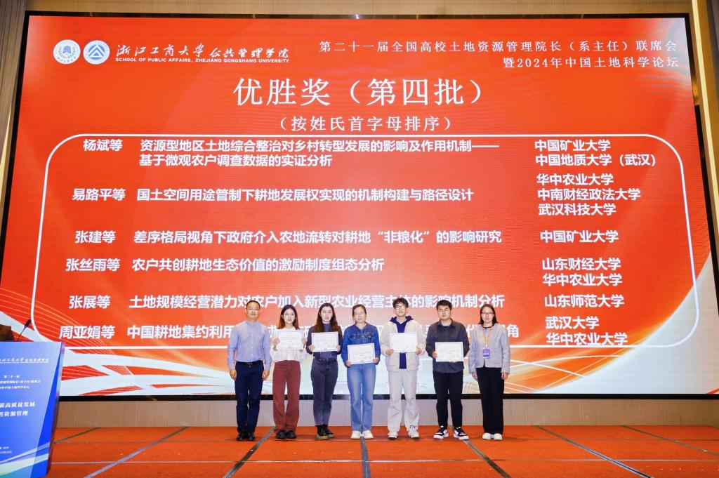 张丝雨与王立业老师合作论文《农户共创耕地生态价值的激励制度组态分析》被评为大会优胜奖,曲衍波副院长作为第一批颁奖嘉宾为获奖论文颁奖。