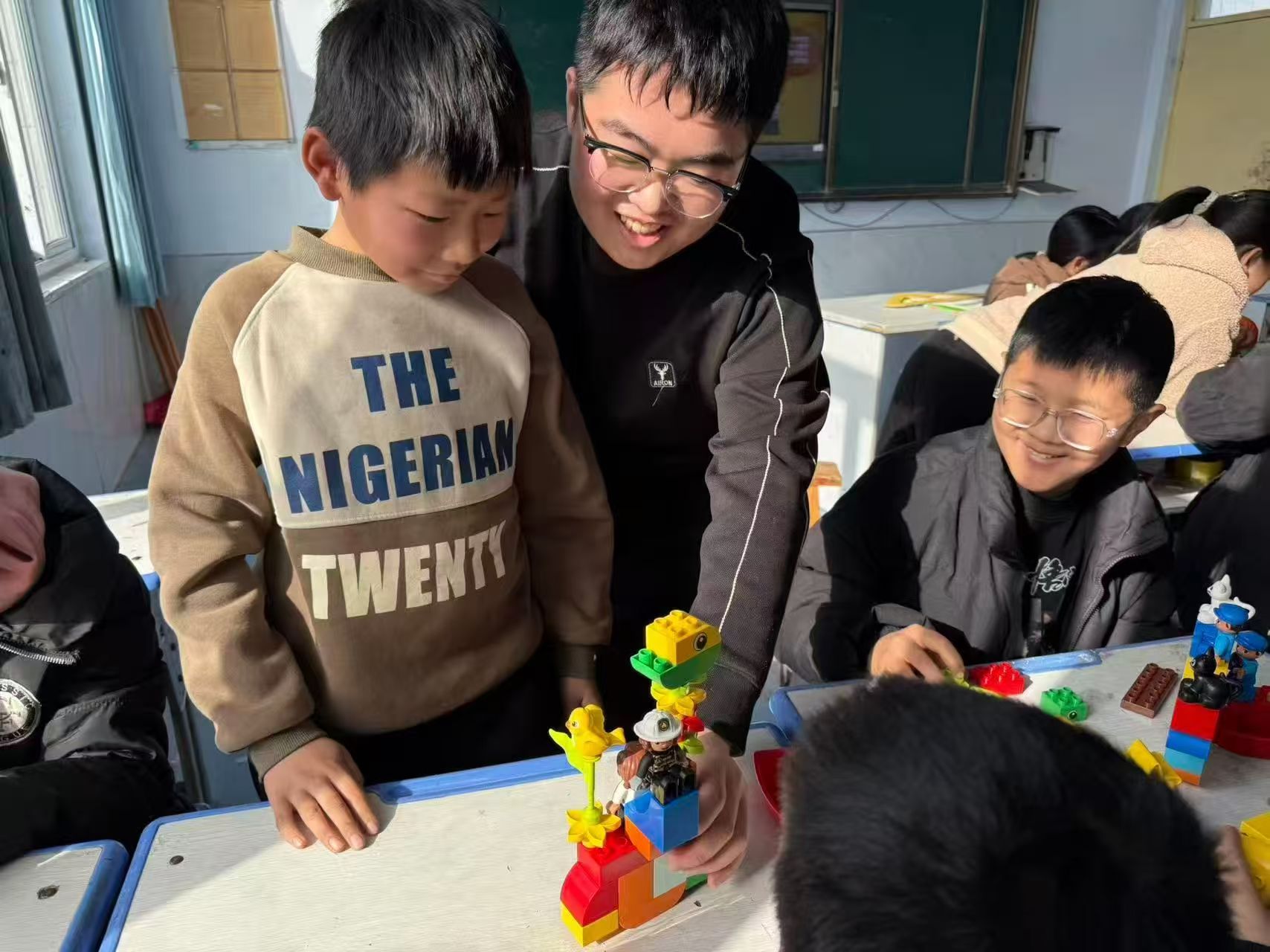 课程中最受孩子欢迎的当属音乐课。还记得上课之前有个小姑娘蹦蹦跳跳地跑过来问我,“老师,音乐课到底是什么?”为了让孩子们感受音乐的美好,我们精心准备了旋律优美的歌曲教给他们。在给五年级上课时,我们教唱《小美满》。课程前半段,运用“拍手”“跺脚”“拍肩”等动作让孩子们更好地理解节拍、旋律等基本乐理知识。后半段,则男女分组演示。两支队伍各有所长:男生队领悟到动作的魅力,虽摆着鬼脸,比着各种手势,可律动竟也融进了音乐;最让人惊艳的当属女生队,她们身体随音乐轻摇,歌声清脆。跟随节拍,孩子们第一次完成了属于自己的音乐表演,每个人都十分开心,“原来音乐课这么有意思,我太喜欢了。”“老师,我们多上点音乐课吧。”那一刻,看着孩子们花一样的笑脸,我心里满是成就感。