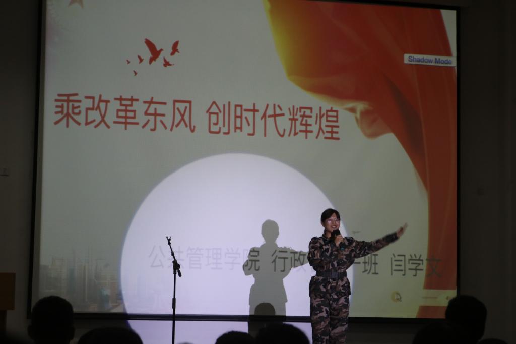 18级行政管理1班的闫学文同学凭借扎实的功底、稳重的台风、高昂的激情、精彩的演讲获得了决赛二等奖。她的演讲以《乘改革东风,创时代辉煌》为题,叙述了中国改革开放四十年来的政治、科技、环保、精神思想等伟大成就,通过守林老人孙志强、最美消防员杨科璋等典型人物传播了爱国爱党的思想,发出了新一代青年人要惜时进取,自强不息的号召,展现了当代大学生向党爱国的精神风貌和对自我价值的认知思考。