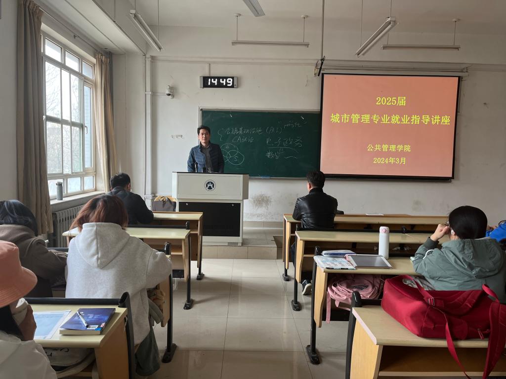 (通讯员 张菁)为增强城市管理专业同学对就业形势、就业方式和就业选择的认识和准备,做好自身职业生涯规划,以积极状态应对就业,3月27日下午,城市管理专业就业指导讲座在圣井校区5242召开。本次讲座由学工办主任张辉主持,学院副院长曲衍波发表讲话,2021级城市管理专业学生参加。