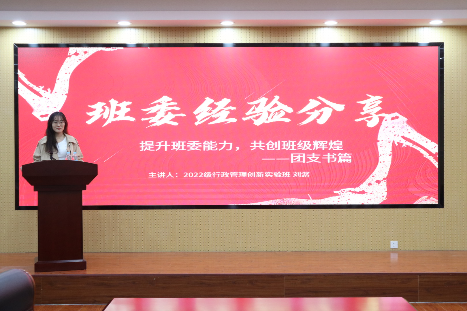 2022级行政管理创新实验班班长杨博文结合自己的工作经验,从班长的责任与义务、工作能力与技巧、实例分析、自我素质与修养提升等角度进行了全面而生动的分享。他强调,班长是整个班级的桥梁和核心,要带头建设学风浓、班风正的优秀班集体,真诚地为同学们服务,带动班集体团结有序发展。